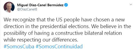 Cubas president Miguel Diaz- Canel, har gratulert det amerikanske folket og Joe Biden med valgseieren og ser fram til et konstruktivt bilateralt samarbeid med gjensidig respekt.