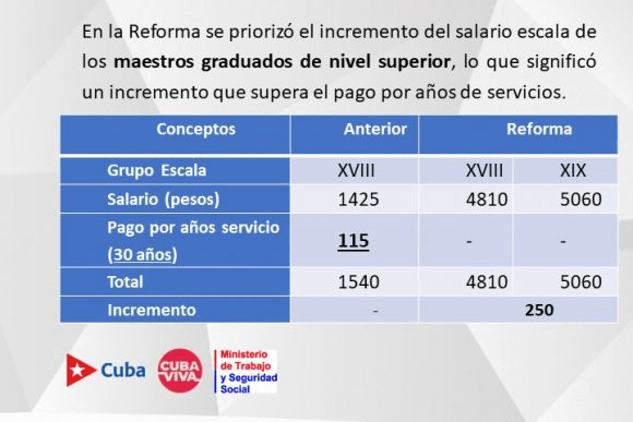 I reformen ble det prioritert å øke lønnen til lærere med høyere utdannelse, noe som betydde en økning som overstiger betalingen for mange års tjeneste. “Det var en gjeld til lærerne. Det var ikke et krav bare av lærere, men av befolkningen og foreldre, fordi det var viktig å garantere kvaliteten på utdanningen på Cuba. Slik at barna våre på alle utdanningsnivåer hadde bedre lærere, mer forberedt.